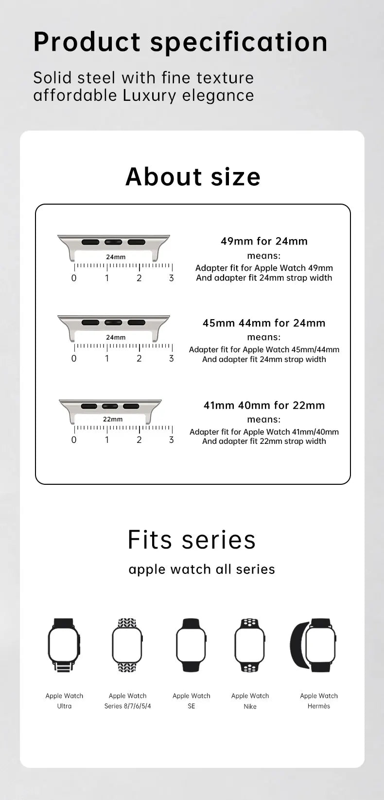If your Apple Watch is 42mm, 44mm, or 45mm, you’ll need an adapter that measures 22mm.
