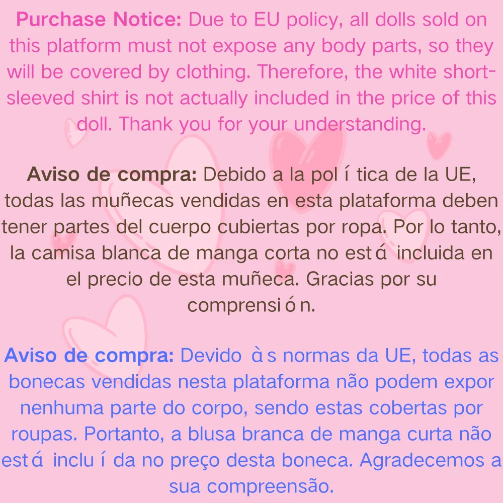 Purchase Notice: Due to EU policy, all dolls sold on this platform must not expose any body parts, so they will be covered by clothing. Therefore, the white short-sleeved shirt is not actually included in the price of this doll. Thank you for your understanding.